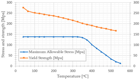 where P is the operating pressure inside the tube, is the outer diameter of the water tube; is the maximum allowable stress, tube thickness which is varied between 1, 2, 3, 4, 5, and 6 mm. Note that both allowable stress and yield strength of carbon steel seamless pipe (SA210 C) are temperature-dependent, as shown in Figure 3.