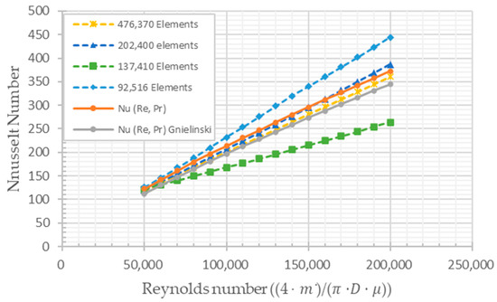 Figure 4 shows the correlation Reynolds Number and Nusselt Number Curve with multiple element numbers of 476,370, 202,400, 137,410, and 92,516 mm (see Figure 5), and the 202,400 cells have been chosen to be accurately sufficient with the correlation of Reynolds Number and Nusselt number and lower computational time.