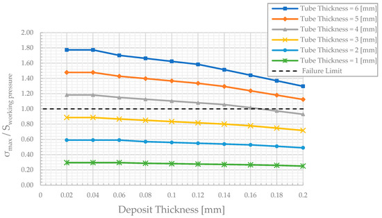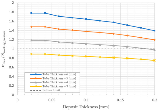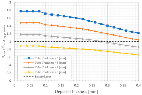 A similar analysis, as previously discussed, is conducted in the present section to determine the minimum tube thickness and shows the effect of magnetite deposit on the average tube temperature under 75% of full load. As shown in Figure 9, the average tube temperature was also affected by the deposits’ thickness. However, it is noted that the temperatures here are lower than what was previously discussed. Furthermore, it can be noticed that the deposit layer with k = 0.625 W/m K, the allowable stress divided by hoop stress Equation (9) at 75% of full load, reaches 1.39, 0.75 in 6 mm and 3 mm tube thickness, respectively; see Figure 10. The minimum thickness of the water wall tube is 4 mm, with magnetite thickness less than 0.18 mm.