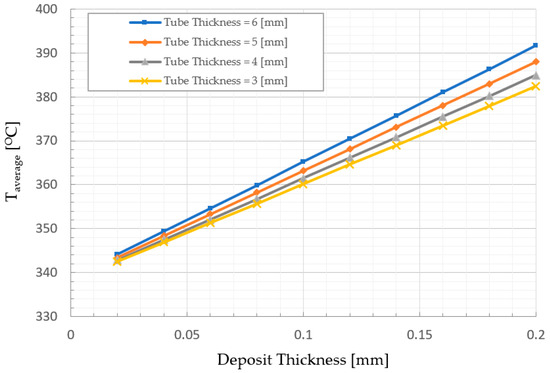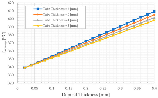 In addition, the average temperature at 50% of full is discussed. As shown in Figure 11, the increase in the average temperature of the water wall tube is conjugated with accumulating deposit layer of Magnetite with low thermal conductivity. For example, the average temperature Taverage reaches 409.38, 405.25, 401.55, and 398.21 °C at tp = 6, 5, 4, and 3 mm, respectively, in the case of td = 0.4 mm, compared with 338.89, 338.92, 339.00, and 338.82 °C in the case of td = 0.02 mm at tp = 6, 5, 4, and 3 mm, respectively.