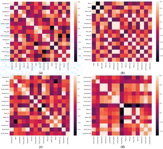 To explore the importance ranking of the relevant features, the top 15 features obtained with the five feature selection methods are listed in Table 2, while the proportions of different types of features in different subsets are shown in Table 3. The results show that the features screened by different feature selection methods presented significant differences. In general, spectral and texture features accounted for a large proportion of the top 15 features. Figure 4 shows the correlation coefficient matrix of the top 15 features of different feature selection methods. The darker the grid color, the smaller the correlation coefficient between the features, and the more negative the correlation between the two features. On the contrary, the larger the correlation coefficient between features, the more positive the correlation between the two features.