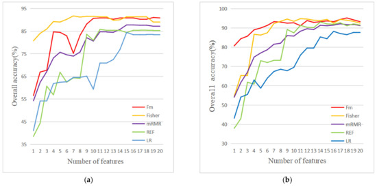 In the case of limited samples, excessive features do not improve the classification accuracy of the image. However, the classification accuracy can be improved to a certain extent by taking into account the correlation between features through the mRMR algorithm or only considering the separability of a single feature through the Fisher Score algorithm. Our experiments showed that the proposed Fm method can effectively improve the classification accuracy of high-resolution remote sensing images with the RF and kNN classifiers.