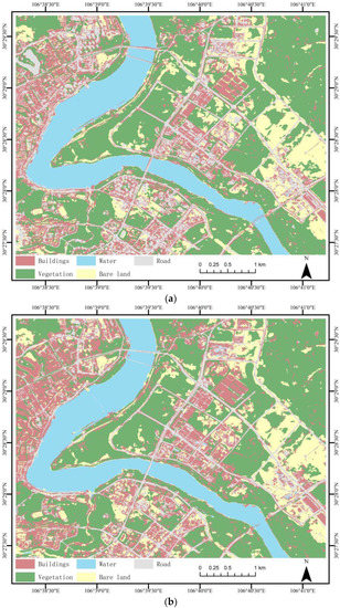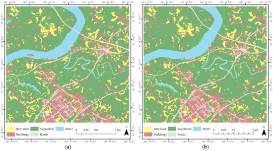 In order to test the effectiveness of the Fm method, we selected different research areas and GF-2 images and carried out experiments. The classification results and overall accuracy with different classifiers are shown in the Figure 8.