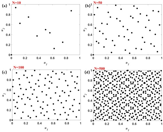 Graphs (a–d) represent the sampling numbers of 10, 50, 100, 500 two-dimensional Sobol sampling schematics, respectively. , are two parameters in the range [0–1].