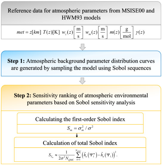 In the first step, the reference data of the atmospheric background parameters with height distribution are obtained from the MSISE00 and HWM93 models. In the second step, the distribution curves of atmospheric background parameters are generated based on the Sobol series sampling of the reference data. In the third step, the sensitivity analysis of atmospheric background parameters is performed using Sobol sensitivity analysis, and the first-order sensitivity index and total Sobol index corresponding to each atmospheric background parameter are calculated.