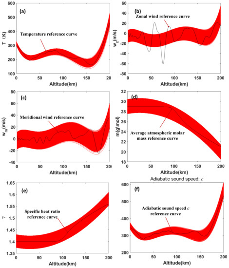 Distribution curves of each atmospheric parameter generated after Sobol sampling (the number of sampling is 1200). The black line represents the reference atmospheric parameter distribution curve, and the red line represents the atmospheric parameter distribution curve generated after sampling. Graphs (a–f) illustrate temperature T, zonal wind speed , meridional wind speed , average atmospheric molar mass m, specific heat ratio , and adiabatic sound speed c, respectively (Data from: https://kauai.ccmc.gsfc.nasa.gov/instantrun/msis, accessed on 15 May 2021).