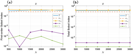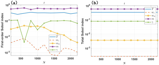 The sampled parameter profiles are imported into the tau-p model as atmospheric background parameters to calculate the corresponding outputs. In this paper, the infrasound propagation distance R is selected as the output of the infrasound propagation physical model. The source position of the tau-p model is set to the ground at an altitude of 0; the elevation angle of the emission angle is set to a fixed value of 30°; the azimuth angle is 45°. The first-order sensitivity index and the total Sobol index of each parameter are solved by the Sobol index method. These two indices can reflect the degree of influence of the atmospheric parameters on the physical model of infrasound propagation. The first-order Sobol index convergence curves and the total Sobol index convergence curves for the five atmospheric parameters are shown in (a) and (b) of Figure 6, respectively. The range of Sobol sampling times N is from 500 to 3000.