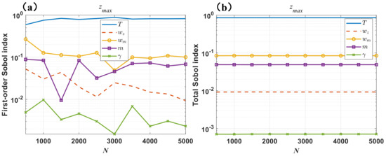 The sensitivity analysis of the atmospheric physical parameters affecting the maximum propagation height of infrasound is performed using the Sobol sensitivity analysis method. The maximum propagation distance is chosen as the output of the tau-p model. The source position of the tau-p model is set to the ground at an altitude of 0; the ray emission angle is set to a fixed value of 30°; the azimuth angle is 20°. The first-order Sobol index convergence curves and the total Sobol index convergence curves for each atmospheric parameter are shown in (a) and (b) of Figure 8, respectively. The range of Sobol sampling times N is from 500 to 5000.
