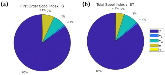 (a) First-order Sobol index pie charts and (b) total Sobol index pie charts representing the five parameters for travel time t. The five uncertain atmospheric environmental parameters are independently and uniformly distributed. The number of Sobol samples N is 2400.