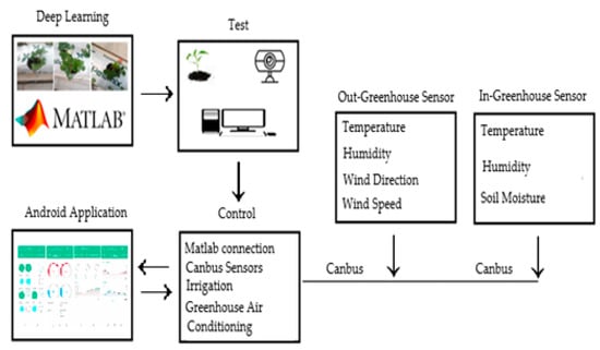 The study was carried out in three stages. Classification of three different growth stages of strawberry plant—seedling, flowering, and crop—was carried out. Secondly, this classification was applied in the real greenhouse. For this, the strawberries grown in the greenhouse were photographed every day at 10:00 in the morning. This photo was tested on the ResNet101 architecture. The result of this operation was sent to the Arduino microcontroller. The microcontroller adjusted air conditioning in the greenhouse according to the state of the strawberry plant. To make this decision, it used data from the temperature, humidity, wind direction, and wind speed sensors outside the greenhouse and the temperature, humidity, and soil moisture sensors inside the greenhouse. Finally, using a mobile application, all data from the sensors and the life stage of the plant were displayed. The mobile application also enabled manual control. Figure 1 shows the general structure of the system.