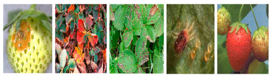 Strawberry diseases (Botrytis cinerea, Sphaerotheca macularis fsp. fragariae, Mycosphaerella fragariae, Tetranychus urticae, Frankliniella occidentalis) used in the dataset.