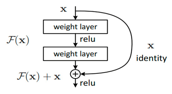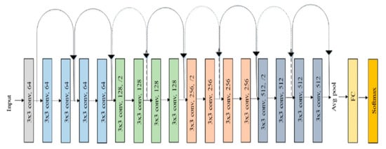 ResNet was developed by He [19]. It was an architecture more deeply designed than all other architectures. It consisted of 152 layers and was also the winner of the ImageNet 2016 competition, with an error rate of 3.6%. Depending on their skills and expertise, humans generally had an error rate of 5–10%. ResNet’s first 34-layer network architecture is shown in Figure 8.