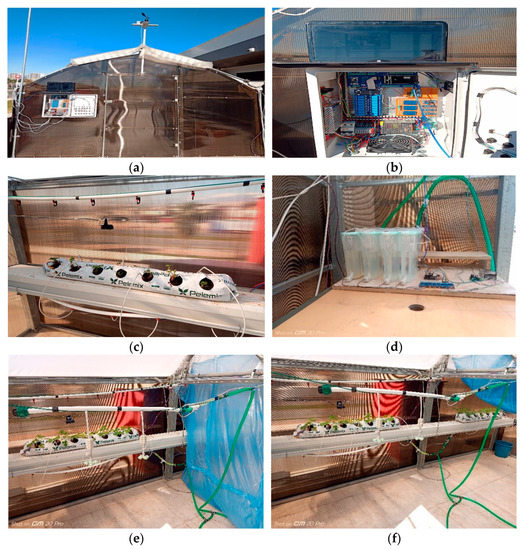 (a) Exterior view of the application greenhouse. (b) Internal view of the control board. (c) View of the strawberry plants, including irrigation system, webcam, and spraying sprinklers. (d) Four different spraying tanks, mixing tank, and control system. (e) General view of the application system with the humidification system included. (f) System controlled by deep learning and normal system view.