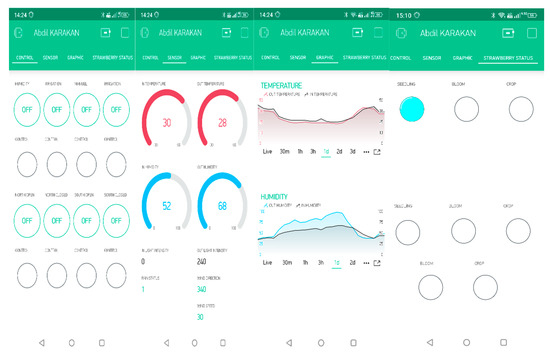 The designed interface consists of four parts: control, sensor, graphic, and strawberry status. In the control section, the system can be controlled either manually or automatically. In this study, when manual control was selected, the north and south ventilation could be opened and closed, the irrigation and humidification of the strawberries grown with deep learning could be controlled, and the irrigation of the normal strawberry plants could be controlled. The control part of the interface provides feedback. When any button in the control part is pressed, the button is first activated and its color changes. The control light at the bottom changes according to the output of the microcontroller. The light is on when the output is active. Thanks to this feedback, it is possible to check whether the system is working or not. In the sensor section, data from sensors inside and outside the greenhouse are displayed. These are temperature, humidity, wind speed, wind direction, rain information, and luminous intensity. In the graphic section, the temperature and humidity values are displayed as instantaneous, 30 min, 1 h, 3 h, 1-day, and 2-day data. In the strawberry status pane, the life stage of the strawberry is shown. The fuzzy logic control values required for humidification are shown. The value from the soil moisture sensor is also displayed.