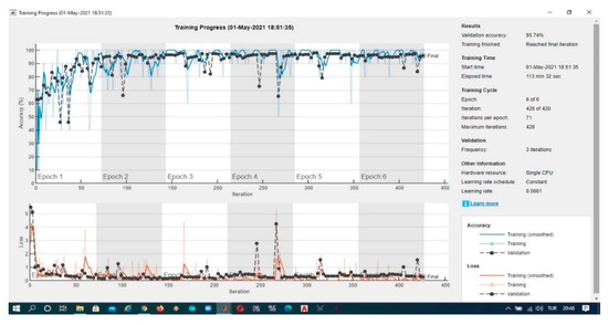Nine different algorithms were used in the study. Of the algorithms used, the ResNet101 architecture gave the highest accuracy rate. ResNet101 architecture had 99.80% accuracy, while a normal person had an error rate of 5–10%. An error rate that is less than human error was determined in this study. All algorithms were loaded with the same database. Although the photos in the database were the same, their sizes differed. Some algorithms used 224 × 224 photos, while others required 227 × 227 or 229 × 229 photos. For the training times, the highest training time was the SqueezeNet architecture, with 981 min. The lowest training time was GoogleNet, with 24 min. GoogleNet had the lowest training time but the highest error rate. The same computer was used for all training periods of the algorithms. Thus, the error rate arising from the system was minimized. Accuracy rates were not directly proportional to the training times. Thus, the parameters and depth of the algorithm were effective. Although SqueezeNet had the highest training time, the accuracy rate remained at 91.31%. Its 1.24 million parameters and 18 depths were far below those of the ResNet101 architecture.