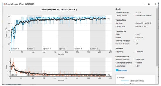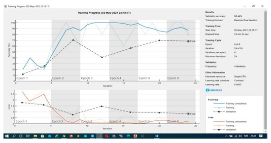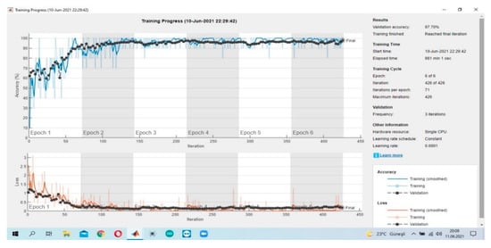 In VGGNet, the depth is 19 and there are 144 million parameters. VGGNet is greater than AlexNet in both depth and parameters. This is reflected in the rate of accuracy. The accuracy rate of VGGNet was 97.70%, approximately 2% higher than the accuracy rate of AlexNet. The training time in VGGNet was 961 min. Buddha was the longest training period. Figure 14 shows the training process of the GoogleNet architecture used in the system.