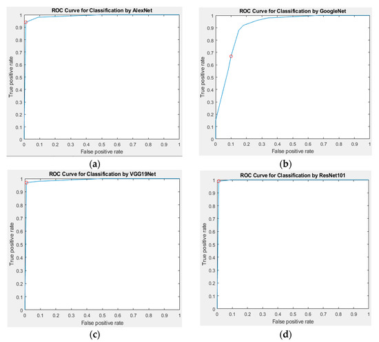Nine different architectures were used in this study. Of these architectures, the learning outcomes of the AlexNet, GoogLeNet, VGGNet, and ResNet architectures are shown. The other architectures shown are versions with increased accuracy rates. The ROC curves of the four different architectures used have been calculated. Figure 16 shows ROC graphs belonging to four different architectures.