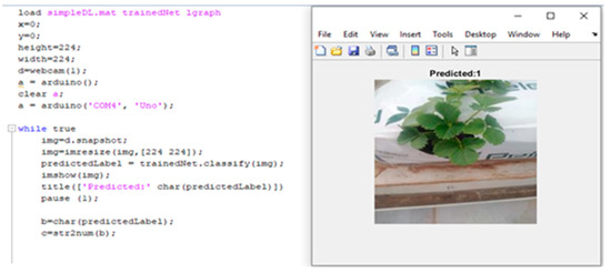 This study was performed in the program MATLAB. A picture was taken with the webcam and processed at 10:00 every morning. It worked with ResNet101 architecture in MATLAB for every process. Training was done with ResNet101 architecture. Testing was done with training files. The test program and program output are shown in Figure 17.