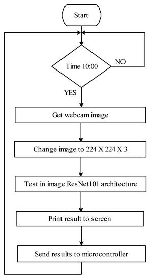 This study was carried out in the real-life environment of the plant. The photo of the plant was assessed at 10:00 every morning. The size of the captured image was first reduced. ResNet101 architecture, which gave the highest accuracy rate in the study, uses 224 × 224 photos as an input. After the size of the captured photo was reduced, the test process was carried out in the ResNet101 architecture. After the test process was finished, the result was obtained and the captured picture was shown on the computer screen. There was a USB connection between MATLAB and the microcontroller. The code for the microcontroller was written in MATLAB. After the test process was finished, the result was sent to the microcontroller. Figure 18 shows the test algorithm.