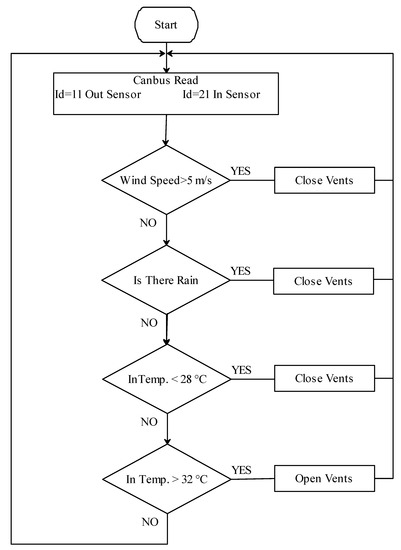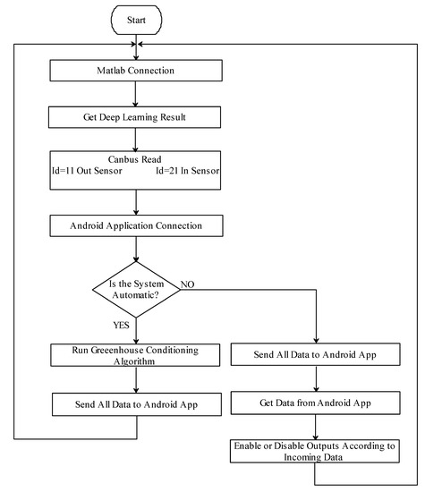 In this study, Canbus communication protocol was used for the communication of internal sensor, external sensor, irrigation, humidification, air conditioning, and the control part of the interface. Thanks to Canbus, communication was provided over long distances with less cables. All systems were connected via a single line with Canbus. Each system was given an ID number. Thus, the required system ID number can be easily found. In this study, 50 Kbit/sec was the preferred communication speed. In this way, data transmission was provided up to 1 km away. Figure 19 shows the general algorithm of the system.