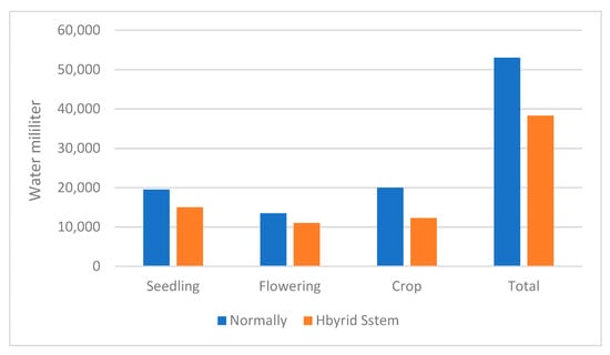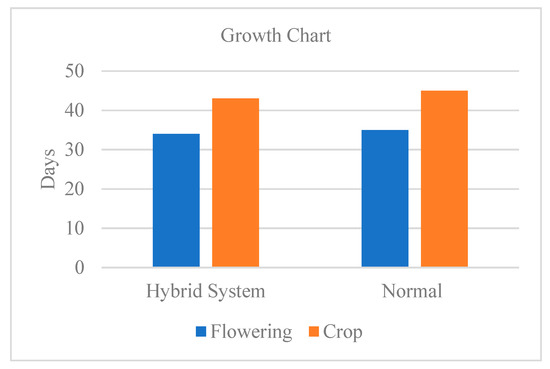 This study was carried out to increase the productivity of strawberry plants. With this in mind, a disease that can occur in the growth phase of the strawberry plant was determined. With this determination, the necessary chemical or chemical mixture was given to the plant and recovery was achieved as soon as possible. At the same time, three life stages of the plant—seedling, blooming, and crop—were determined. Between these stages of the strawberry plant, the climate needs to be adjusted. The sooner that the indoor air conditioning becomes suitable for the stage of the plant, the more that the efficiency will increase. In Figure 21, the efficiency of the system irrigated with the normal and the hybrid system is compared.
