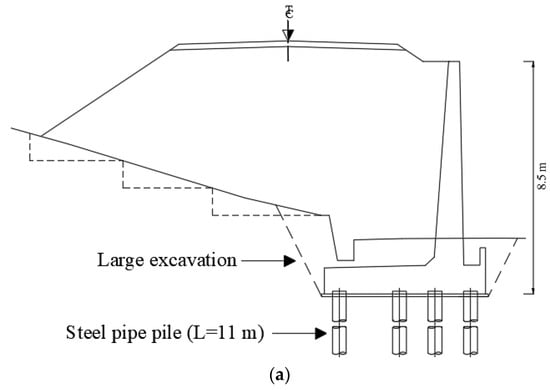 The approach block is used to mitigate differential settlement; material with medium stiffness is placed between the abutment concrete structure and the subgrade on the back of the abutment, thereby smoothing the change in stiffness of the subgrade. Studies related to the approach block were conducted which focused on several materials [2,3,4] and ground-reinforcement strategies [5,6]. Cement-treated gravel is a material typically used for the construction of approach blocks [7,8,9]. When graded gravel is mixed with a certain amount of cement (3–5%) and compacted, it exhibits a stiffness greater than that of graded gravel (without cement) [10,11]; thus, the difference in stiffness between backfill and concrete structures can be mitigated.