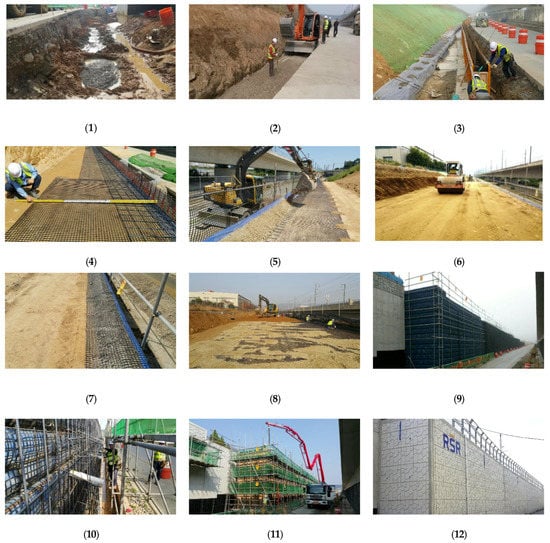 RSR construction process. (1) Installation of cast-in-place concrete pile; (2) bench cut, spreading, and compaction processes of 3% cement-treated gravel; (3) installation of small strip foundation; (4) installation of geogrids and nets of welded rebars; (5) laying of 3% cement-treated gravel; (6) compaction; (7) rolling up the geogrid; (8) repetition of steps (4) to (7) to obtain the 17th layer; (9) stabilization of the embankment; (10) installation of rebars and connectors; (11) installation of forms and placing of concrete for rigid wall; (12) curing and completion of RSR.