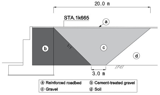 The RSR was constructed at a height of 2.6–7.4 m and, including abutment transition zones, the total length was 156.0 m in STA.1k662.90–1k820.00 of the Osong railway test line in Korea. In this study, the STA.1k665 cross section in the abutment transition zone was selected for stability analysis, and its behaviors were subsequently evaluated.