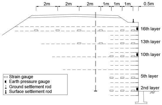 To analyze the behaviors of the RSR which was applied to the abutment transition zone, 19 geogrid strain gauges, 3 horizontal earth pressure gauges, and settlement rods for the ground and the backfill surface were installed and measured during the construction process. The long-term measurements were conducted over a period of 16 months, including the 2.6 month-long construction period, and the RSR behaviors were identified. A schematic view of the measuring sensors is illustrated in Figure 5.