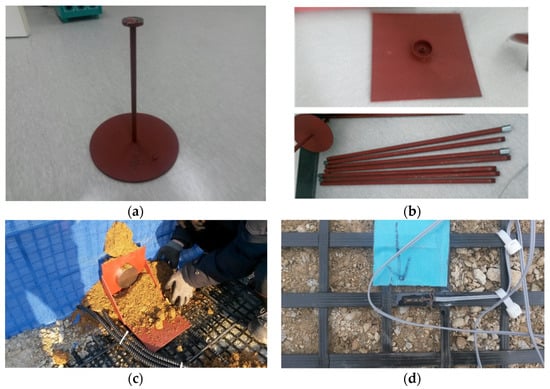 To distinguish the settlement of the ground and embankment, the settlement rods were placed on the ground and backfill surface, respectively. The settlement rod for the ground comprised a 1 m × 1 m square plate and a rod with a 15 mm diameter that could be extended as the backfill height was increased by 1 m. The surface settlement rod, featuring a circular steel plate with a 300 mm diameter and an attached 400 mm high rod, was installed at a distance of 0.5 m from the edge of the backfill. Considering the field conditions, the settlement measurements were performed after the completion of the embankment construction (from day 23 to day 274). The horizontal earth pressure gauges were installed at the net of the welded rebars at the 2nd, 10th, and 16th layers to observe the variation in the horizontal earth pressure with respect to the height. The strain gauges were installed on the 2nd and 5th layers and the 10th, 13th, and 16th layers for the short and long geogrids, respectively. The strain gauges on the short geogrids were installed at a distance of 0.5, 1.5, and 2.5 m from the exterior of the reinforced backfill. The strain gauges on the long geogrids were installed at a distance of 0.5, 1.5, and 2.5 m for the 10th layer, 0.5, 1.5, 3.5, and 5.5 m for the 13th layer, and 0.5, 1.5, 3.5, 5.5, 7.5, and 9.5 m for the 16th layer. The installed sensors used for the measurements are shown in Figure 6.