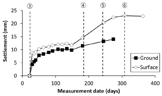 The settlements of the ground and surface of the embankment over time after the construction of the reinforced backfill are plotted in Figure 7, and the circled numbers indicate the work schedules stated in Table 3. Settlement measurements were performed for 341 days and for 252 days for the ground and surface, respectively, after the reinforced backfill was completed. The surface settlement changes considerably immediately after the completion of the reinforced backfill construction and converges over time. In particular, the maximum surface settlement is 23.1 mm less than the allowable residual settlement stated in the Korean Railway Design Standard for roadbed construction (30 mm).
