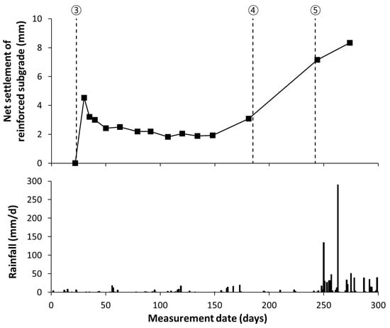 The difference in settlements of the ground and surface of the backfill was considered as the net settlement of the backfill. The variation of net embankment settlement and rainfall over time is plotted in Figure 8. Immediately after the completion of the reinforced backfill construction, a compression settlement of 4.5 mm occurred and exhibited a stable condition (1.82–3.09 mm) prior to the wall’s construction. The rate of total net settlement of the reinforced backfill was 0.12%. Moreover, additional settlements of 4.06 mm and 1.19 mm occurred owing to the construction of the rigid facing wall and heavy rainfall, respectively. Because the reinforced backfill supports the wall in the RSR structure, additional settlement occurs under the weight of the wall. During heavy rainfall, additional settlement occurred as the soil particles were relocated by the water penetrating through the reinforced backfill [26,27]. Considering the reinforced backfill height of 6.8 m, the rates of each additional settlement were 0.06% and 0.02%, respectively. The low compressibility of the RSR when using cement-treated gravel as a backfill was confirmed.