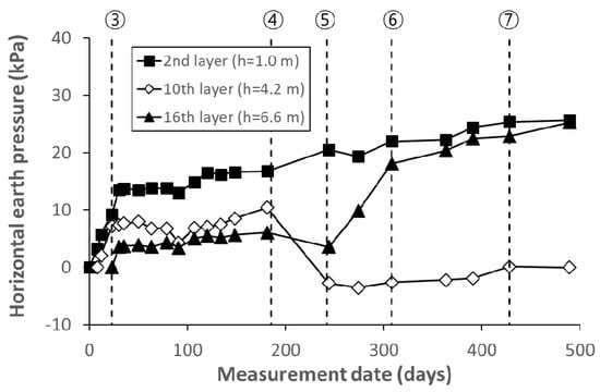 The variation in the horizontal earth pressure as a function of the height over time is represented in Figure 9. During the construction of the reinforced backfill, the pressure increases with the weight of the soil, which is the largest at the second layer. Even after the completion of the reinforced backfill, the horizontal earth pressure increases moderately without any increase in the overburden load. The increase in earth pressure generated during the backfill stabilization process was similar to that of the RSR using sand soil as a backfill [23]; however, this value was considerably smaller for the backfill using cement-treated gravel.