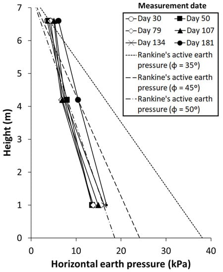 For the period between the completion of the reinforced backfill and the initiation of the rigid face wall, the variation in the distribution of the horizontal earth pressure with respect to the height is plotted in Figure 10. The horizontal earth pressure in the second layer (1.0 m) increases from 41% to 54% of the Rankine’s active earth pressure considering the friction angle of 35° used in an existing design. Moreover, it increases from 45% to 63% and from 87% to 148% of the Rankine’s active earth pressure in the 10th layer (4.2 m) and 16th layer (6.6 m), respectively. Except for the 16th layer, which is heavily influenced by the external environment, such as construction works, the horizontal earth pressure in all layers is similar to that of granular soil with a friction angle of 45–50°. This entails an increase in the shear strength of the backfill in the RSR using cement-treated gravel. Notably, the higher the shear strength, the higher the stiffness encountered in the soil will be [28,29], and, accordingly, the low compressibility of the RSR can be confirmed indirectly.