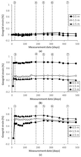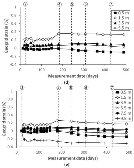 The variation in the geogrid strain measured at the layers over time is illustrated in Figure 11. The maximum increase in the geogrid strain of 0.811% during and after construction was measured at the fifth layer. This value is equivalent to 16% of the geogrids’ design tensile strain (5%). In addition, the maximum geogrid strain of 0.784% was measured at the fifth layer (2.2 m) during the construction of the reinforced backfill.