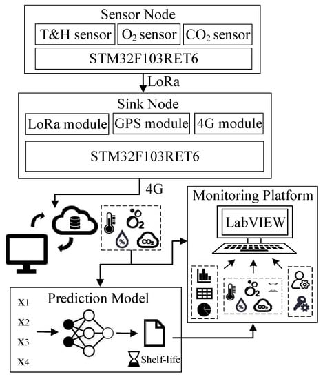 The sensor node integrates temperature and humidity sensors, oxygen sensors and carbon dioxide sensors. It can transmit the environmental parameters collected in the cold chain transport compartment to the sink node through LoRa wireless communication module. The sink node uploaded the environmental parameters to the database through 4G communication, together with the location information of the transport vehicle received by the GPS module. The BP neutral network built with MATLAB could realize effective prediction of shelf life. The host computer monitoring platform was developed with LabVIEW software. It could visualize the internal environmental status of the refrigerated compartment and the quality of the goods in the form of charts and graphs to provide decision support for managers.