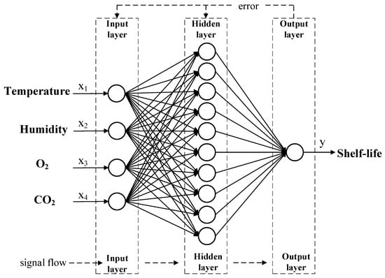 The shelf-life prediction model based on a BP neural network used four environmental parameters (temperature, humidity, oxygen, and carbon dioxide concentration) as input signals for shelf-life prediction, and the environmental parameters were received by the environmental data acquisition unit of CCT-QPS. The process of constructing the BP neural network was as follows [16,17]:
