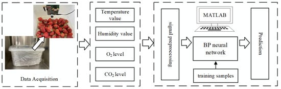 In traditional quality modeling research about cold chain logistics of fruits and vegetables, many scholars at home and abroad have widely used the zero-order or first-order reactions model based on chemical kinetics. The Arrhenius equation was used to perceive the state of quality by temperature [3,4,5], but the modeling method above only takes one single environmental factor into account. There are many kinds of environmental parameters that cannot be ignored, in addition to temperature, such as relative humidity [6], oxygen, carbon dioxide [7,8], and so on. Each of them has an impact on the quality of fruits and vegetables. Therefore, it is critical to achieving comprehensive quality state analysis with multiple environmental parameters. With the universal utilization of artificial intelligence algorithms in the field of food shelf-life prediction in recent years, many scholars have studied quality prediction models based on neural networks [9,10]. They implemented the remaining shelf-life prediction of food with related physical and chemical indexes. In addition, the prediction performance of this method is more accurate compared with traditional dynamic models [11]. Regardless, the physiochemical indexes are multiple and hard to be determined in real time during CCT; thus, it is not easy to implement in practice. Therefore, in the strawberry supply chain, it is essential to improve the real-time performance of commodity quality perception in the step of CCT. At this point, it is necessary to use the quality modeling method based on an artificial intelligence algorithm and comprehensively consider a variety of environmental parameters to monitor the state of commodity quality effectively.