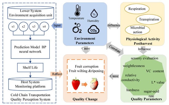 During CCT, the losses are often caused by the inability to perceive the quality changes of perishable food in real-time. The quality changes of strawberries are impacted by the multiple microenvironmental parameters reacting together (Figure 6). This paper selected four environmental parameters, which had the most important impact on strawberry quality.