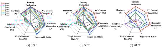 It can be seen from Table 4 that there were correlations among oxygen concentration, carbon dioxide concentration and sensory evaluation, hardness, weight loss rate, and VC content at 0, 5, and 20 °C. The oxygen concentration also had a strong correlation with the L* value. According to the analysis in Section 3.2.2, the relative humidity only had a significant change in the first 4 h at 20 °C, and the difference was relatively stable after that. Therefore, there was no obvious correlation with each quality parameter in this condition. However, relative humidity had an obvious correlation with hardness, weight loss rate and VC content at 0 and 5 °C. Therefore, the effect of relative humidity on fruit quality could not be denied.