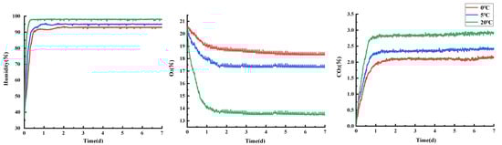 The data collected from the constant temperature experiment are shown in Figure 8. The relative humidity changed more rapidly than oxygen and carbon dioxide concentration. The relative humidity reached more than 90% in 10 h and 8 h at 0 and 5 °C under the condition of the initial value of 38%, respectively. They were stable at about 93% and 95%, respectively ,while the relative humidity in the microenvironment reached 90% within 4 h and finally stabilized at about 98% at 20 °C. Due to the respiration and microbial action of the strawberry fruit, the oxygen concentration in the microenvironment generally showed a downward trend. In contrast, the carbon dioxide concentration showed an upward trend. With the increase in the ambient temperature, the speed of the gas concentration reaching the steady value was also accelerating. Consuming oxygen and releasing carbon dioxide was the fastest at 20 °C. Under this temperature condition, the oxygen concentration dropped below 15% after 16 h. It kept at about 13.5%, and the carbon dioxide concentration value rose above 2.5% within 15 h and finally stabilized at about 2.8%.