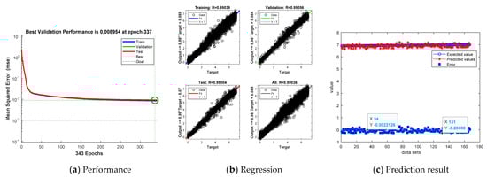 The BP neural network stopped when the Validity Checks reached 6, the number of epochs was 343, the best validation performance was 0.008954 at epoch 337 (Figure 9a), and the R-value was close to 1 (Figure 9b). According to Figure 9c, most of the predicted values fall on the actual value. The error was in the range of 0.002–0.267 d. It can be seen that the proposed model was in high prediction accuracy and could meet the requirements of shelf-life prediction.