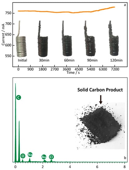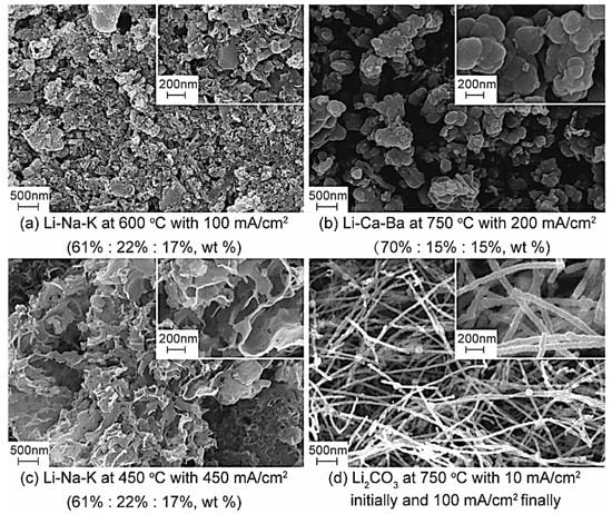 - Wu, H.; Li, Z.; Ji, D.; Liu, Y.; Li, L.; Yuan, D.; Zhnag, Z.; Ren, J.; Lefler, M.; Wang, B.; et al. One-pot synthesis of nanostructured carbon materials from carbon dioxide via electrolysis in molten carbonate salts. Carbon 2016, 106, 208–217. [Google Scholar] [CrossRef]