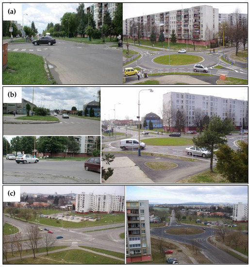Photos of the intersections (a) R1, (b) R2 and (c) R3 before (left) and after (right) reconstruction to roundabouts in Michalovce City.