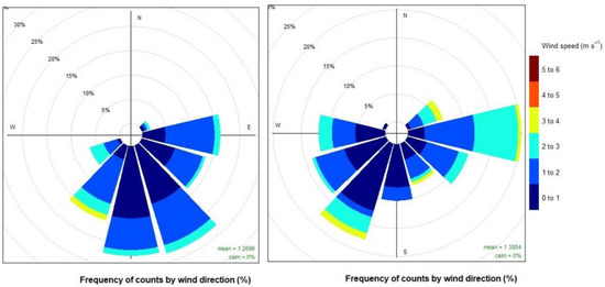 The wind rose values obtained from real measurements of wind speed and direction were used to model noise propagation in the vicinity of the aforementioned intersections (Figure 5). At the three-arm intersection, the prevailing winds were from the south and southeast directions. At the roundabout, the prevailing winds were from the southwest and east directions.