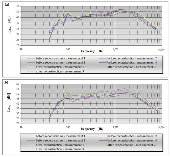 Comparison in the 1–3 octave bands of equivalent noise level LAeq from road traffic before and after the reconstruction of intersections in Michalovce: (a) R1 and (b) R2.