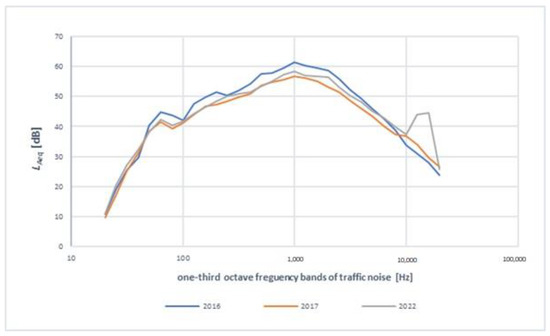 Comparison in 1–3 octave bands for equivalent noise levels from road traffic before and after the reconstruction of an intersection in Zilina at MS1 for years 2016 (before reconstruction), 2017 (immediately after reconstruction), and 2022 (five years after reconstruction).