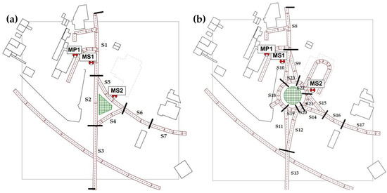 Two measuring stations (MS1 and MS2) were chosen as reference points for the assessment, and real noise load measurements were also carried out. At the same time, one reference modeling point (MP1) was chosen near the exposed building for the comparison of the noise load coming from road traffic at the proposed intersections (Figure 3).
