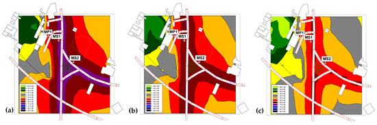 Model of the spreading of noise emissions from road traffic in the vicinity of the original three-arm intersection in the city of Žilina (T_16) during the (a) daytime, (b) evening and (c) night-time.