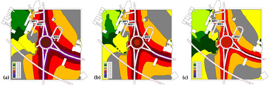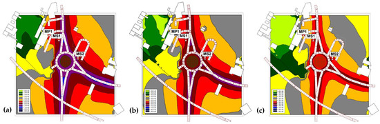 Model of the spreading of noise emissions from road traffic in the vicinity of the roundabout after 5 years of use in the city of Žilina (R_22) during the (a) daytime, (b) evening, and (c) night-time.
